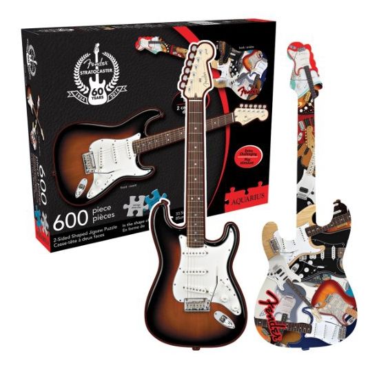 Un puzzle de forme à 2 côtés d'une guitare Fender Stratocaster Fender Classic Maple-Brown, avec un collage de guitares Fender de divers design de l'autre côté.