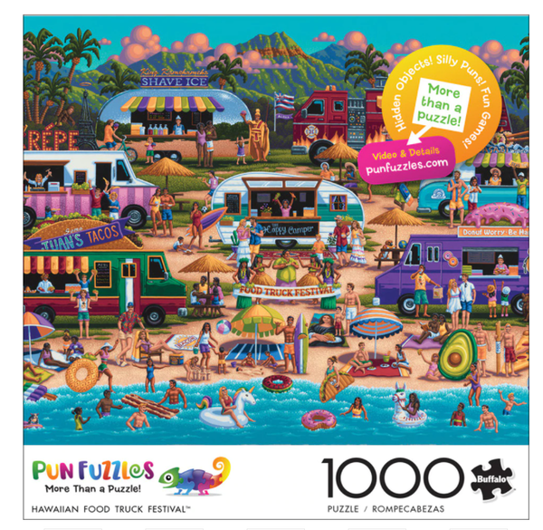 Le Festival des camions de restauration hawaïenne est un puzzle amusant de 1 000 pièces de Buffalo Games. C’est plus qu’un puzzle ordinaire, c’est un punition! Ce puzzle présente un festival dynamique de camions de restauration de la scène de la plage hawaïenne. Les amateurs de plage profitent de la nourriture savoureuse et d'un plongeon dans l'océan. Au fur et à mesure que vous terminez ce défunt, vous découvrirez des jeux de mots, des jeux et des significations cachées du puzzle qui vous divertiront pendant des heures. Voyez si vous pouvez les trouver tous!