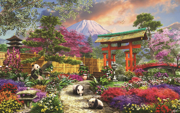 Panda Bears jouant dans un beau jardin coloré avec un volcan en arrière-plan.