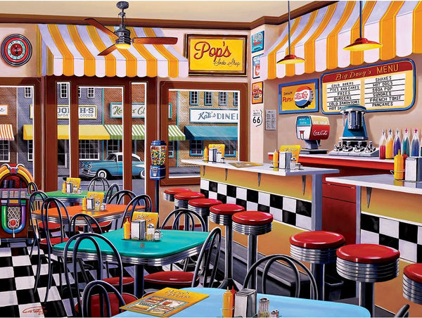 La fontaine de soda de Pop propose un restaurant classique avec des sièges côté bar, des tablettes colorées et des revêtements de sol à carreaux.