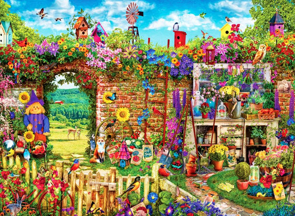 Un jardin bondé et coloré avec une arc en briques menant aux plaines ouvertes.Comprend un support de boîte pour faciliter la résolution du puzzle.