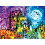 Une nuit effrayante à Halloween, avec le manoir hanté illuminé sous la lueur de la pleine lune.