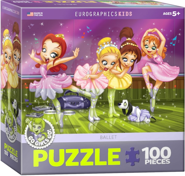 Get ready to dance with this Eurographics "Ballet" puzzle. This 100-piece puzzle captures a delightful scene of four aspiring ballerinas and their adorable dog companion. Set in a sparkling dance studio, the puzzle's vibrant colors and fun illustration will inspire any young dancer to "Go Girls, Go!