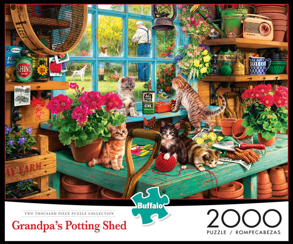 Adorables chatons gambadent dans le hangar de rempotage de grand-père tandis que grand-père travaille dans le jardin avec sa petite-fille et Jack Russell Terrier. Le jardinage n'a jamais l'air plus mignon que dans ce puzzle de 2000 pièces!
