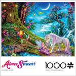 Ce puzzle de 1000 pièces, Unicorn Haven, est basé sur l'œuvre d'art d'Aimee Stewart. Une licorne majestueuse peut être vue à côté d'une belle fée dans une forêt magique au clair de lune.