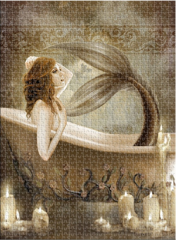 Élégant et serein, une sirène époustouflante se déroule dans un bain romantique. Ce puzzle de 1000 pièces capture la créature mythique dans un moment de relaxation tranquille, car elle passe un peu de temps dans le monde mortel.