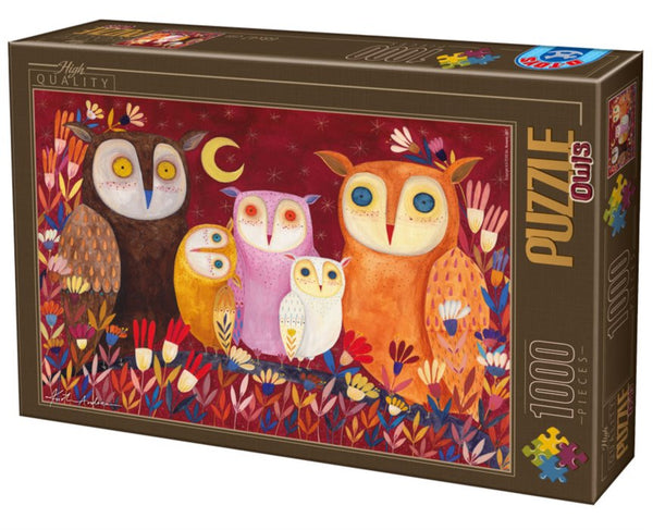 Des hiboux stylisés de différentes couleurs et formes, perchés sur une branche cachée par des fleurs.