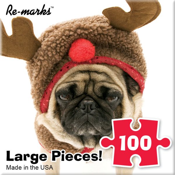 Ce 100 grand puzzle carré présente un chien portant un chapeau de renne.