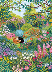 Friendship blooms in this fabulous garden landscape. A striped ginger and a black cat cuddle while surrounded by blooms of every color. A happy puzzle experience for lovers of colour and contemporary illustration. Artist Yuna Moona focuses on whimsical pet illustration and lifestyle art. A challenging 1000 piece garden puzzle.