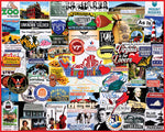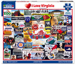 J'adore la Virginie. Le 10ème État dans l'Union, la Virginie est connue pour être «le lieu de naissance de la nation» parce que c'était le site de la première colonie anglaise. Être la maison de la plus grande base navale du monde, la station navale Norfolk, et le plus grand immeuble de bureaux du monde, le Pentagone, Virginie est également le lieu de naissance de 8 présidents américains. Bien que la Virginie soit riche en histoire américaine, elle est également connue pour le plaisir. Avec 10 120 miles de rivage, Virginia offre à de belles plages de foule à affronter et fait partie de 2 chaînes de montagnes avec plus de 600 miles de sentiers. N'oubliez pas les parcs d'attractions, la musique et bien sûr la nourriture. L'artiste Charlie Girard a rassemblé beaucoup de choses que les autochtones et les touristes reconnaîtront dans ce puzzle de style collage de 1000 pièces.