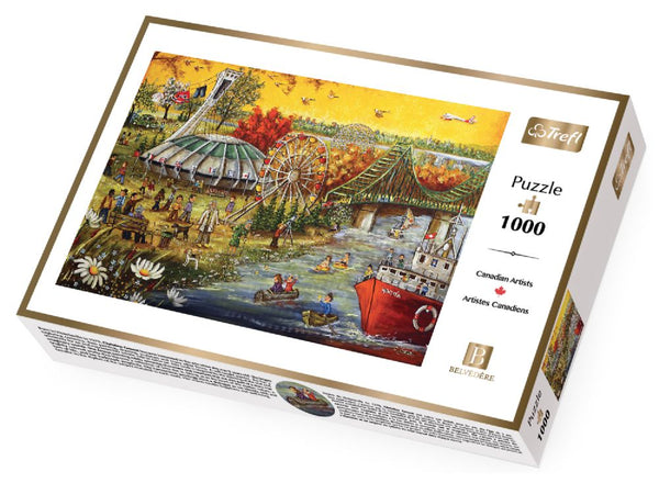 Célébrez l'anniversaire de Montréal avec ce puzzle de 1000 pièces de Christine Genest. Ce puzzle montre une scène de monuments célèbres autour de Montréal et des gens qui profitent de diverses activités à l'extérieur. Stadium olympique ("The Big-O"), Montréal Expos, Canadiens de Montréal, Jacques-Cartier, The Old Port, Poutine, Montréal Fmoked-Meat, The Fuve Saint-Laurent, Lachine Canal, Horse & Buggy Rides et plus!