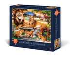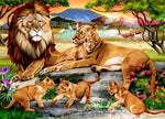 Cette douce scène Serengeti est une question de beauté de la nature et de la fierté familiale. Un trio de Cubs espiègles bondit et éclaboussata le trou d'eau tandis qu'un autre cub nauzz sa puissante mère. Le patriarche à crinière surveille son couvée alors que les antilopes paissent dans les hautes herbes sous le sommet enneigé du mont Kilimandjaro.