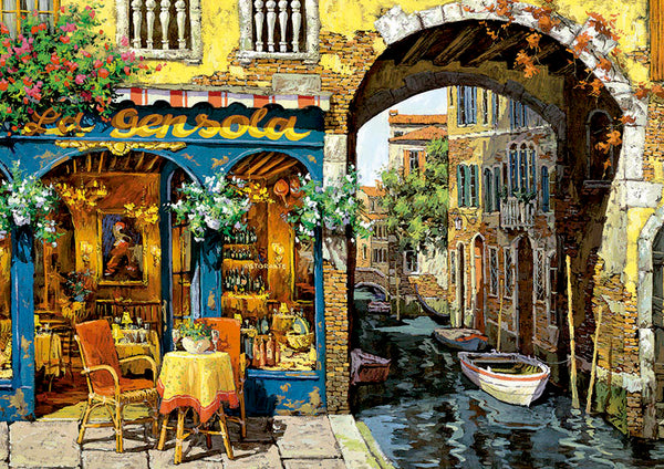 Un restaurant italien par un canal, une table pour deux disponibles sous le soleil.