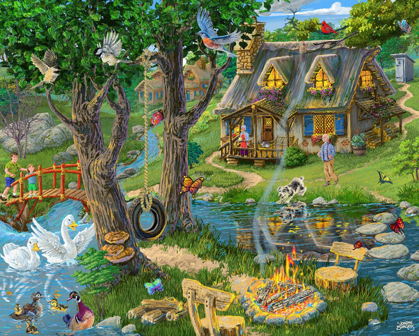 Ce puzzle de Lakeside Cottage, présente des gens dans un chalet avec beaucoup de choses qui se passent.