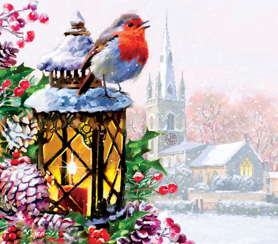Un oiseau majestueux se trouve au sommet de la lampe enneigée. Art par le MacNeil Studio.