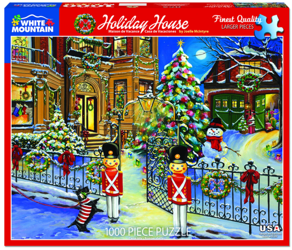 Des soldats de jouets souriants mignons se tiennent debout et accueillants à la porte de cette joyeuse maison de style victorien, habillé gaiement pour les vacances. Les arbres enneigés, les luminarias, les couronnes et les guirlandes fissent l'extérieur tandis qu'à l'intérieur de la maison, chaque pièce présente un arbre couvert de boules! Artiste Joelle McIntyre. Puzzle de 1 000 pièces avec une taille finie de 24 ”x 30”.