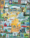 Ce puzzle d'État américain honore le grand état du Michigan, à la fois en tant que centre industriel et paradis du sportif. Avec un rivage le long des Grands Lacs, le Michigan est populaire auprès des amateurs de loisirs d'été aux États-Unis et au Canada. Ses bois du Nord regroupent de cerfs et d'autres jeux intérieurs. Connu pour ses grandes équipes de football universitaire, le Michigan abrite également les Red Wings de Detroit, vainqueurs de la Coupe Stanley de Hockey.