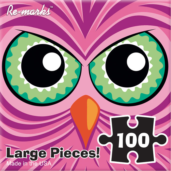 Ce 100 gros morceau de puzzle en cubes présente un monstre de hibou rose.