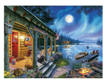 Moonlight Lodge, un magnifique puzzle de puzzle de 1000 pièces de Darrell Bush, est situé sur le bord de l'eau et accueille les plaisanciers pour la soirée. La douceur douce du feu de camp sous le ciel clair de lune fait se détendre sur le porche en attendant que leurs propriétaires reviennent au rivage. Les lumières d'une cabine lointaine se reflètent sur la surface lisse de l'eau montrant qu'elle est une nuit parfaite pour pagayer autour du lac.