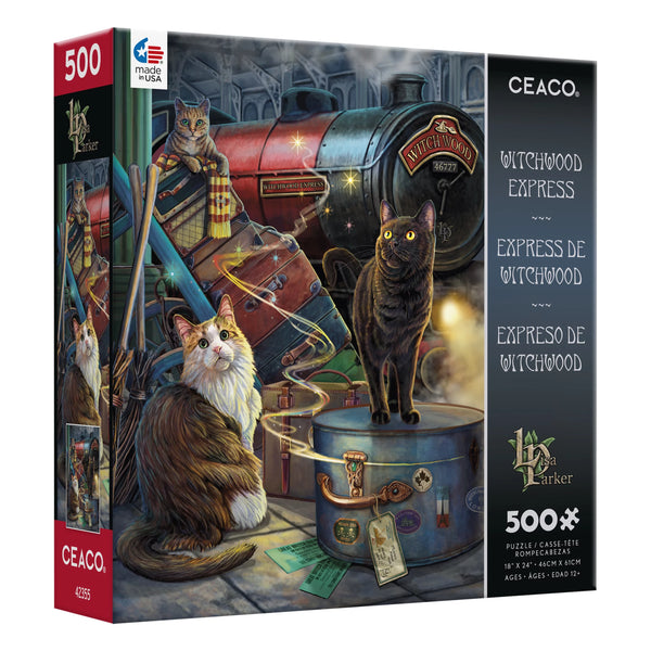 Ce puzzle de 500 pièces de l'artiste Lisa Parker propose un trio de chatons assis parmi un tas de bagages dans une gare, devant un train partant. L'énergie mystique émane d'une boîte de chapeau où se tient un chat noir. Une affiche bonus est incluse. Les dimensions du puzzle sont de 18 x 24.