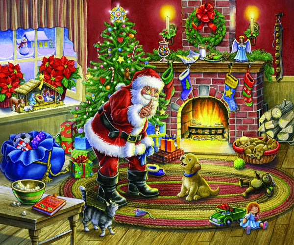 Le Père Noël essaie de calmer ses amis à fourrure afin qu'il puisse livrer les cadeaux dans ce design de Noël amusant. Les puzzles sur le thème des vacances sont parfaits pour passer le temps et construire l'anticipation pour Noël. Ils font également de grands cadeaux pour les enfants et les adultes! Tous nos énigmes de puzzle signature sont fabriquées aux États-Unis avec des matériaux recyclés. Les pièces entièrement imbriquées et formées au hasard constituent une expérience de construction de puzzle agréable. Chaque puzzle est produit sur une planche épaisse et de qualité parfaite pour le montage et le cadrage. Ce puzzle comprend 1000 pièces et mesure 30 "x24" une fois terminé. Oeuvre de Rose Mary Berlin.