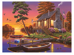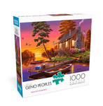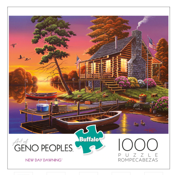New Day Dawning est un magnifique puzzle de Jigsaw de 1000 pièces de Geno Peoples par Buffalo Games. Ce puzzle présente un ensemble de cabanes en rondins classiques sur le Lakeshore donnant sur un coucher de soleil pittoresque réfléchissant sur le lac. La cabine est entourée de belles fleurs, et il y a plusieurs canoës et une chapelure amarrée le long de la fois. Pouvez-vous trouver l'écureuil, les canards et les oies autour de cette propriété de sérine?
