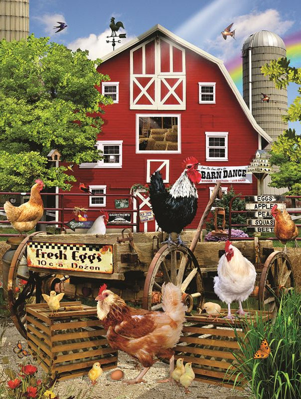 Poussins de bébé, poules et coqs à l'extérieur de la grange.