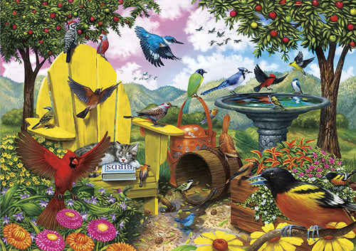 Hidden Birds est un puzzle de 500 pièces de la collection Buffalo Games Amazing Nature. Comme un chat gris dormait rapidement sur la chaise Adirondack jaune vif, rêvant des oiseaux qu'il venait de lire, il a visité quelques amis. La gamme colorée d'oiseaux, d'un cardinal rouge vif à un merle bleu et à divers oiseaux chanteurs, profite tous de traîner autour du bain de bain d'oiseaux et de fleurs. Les arbres avec des pommes vertes et rouges encadrent la scène comme des montagnes et un ciel bleu et rose sont l'arrière-plan. Ce puzzle a 18 images cachées à trouver!