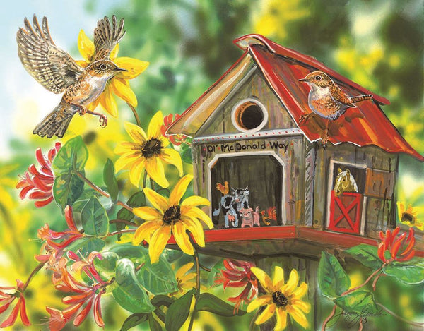 Une maison d'oiseaux dans un jardin peint à l'image d'une grange.