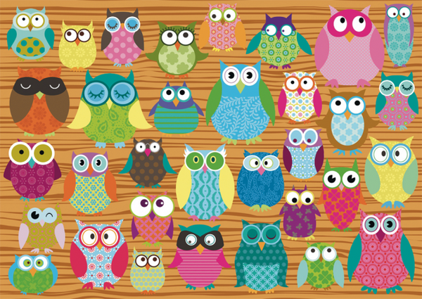 Ce puzzle de 500 pièces de hiboux propose une variété de chouettes de dessins animés de différentes couleurs.