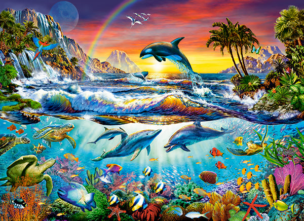 Les orques sautent, les dauphins jouent et les tortues de mer nagent sous un soleil couchant dans ce magnifique puzzle avec l'art d'Adrian Chesterman.