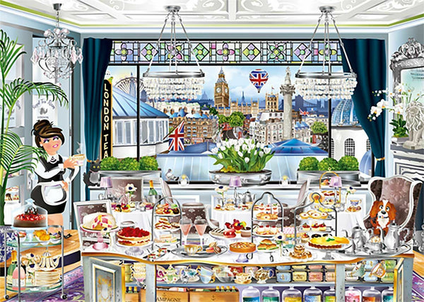 L'illustration colorée d'un café londonien montre une exposition alléchante de gâteaux, de tartes et de biscuits. Une vue sur les célèbres points de repère de Londres peut être vu en arrière-plan.