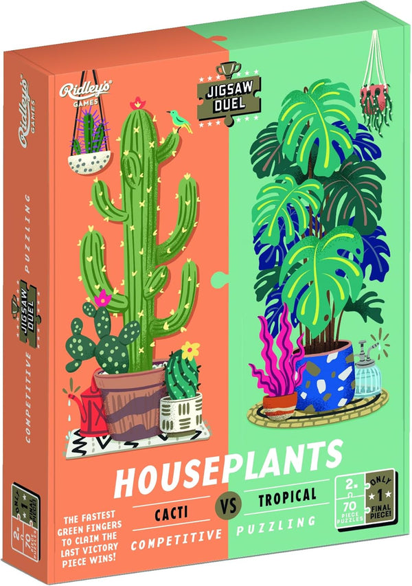 Vous ne voudrez pas mousse lorsque vous allez en tête-à-tête dans cette maison de duel de jigsaw des matchs de Ridley! Dans ce jeu de puzzle innovant et compétitif, vous et vos collègues camarades avez chacun un puzzle sur le thème de la plante à la maison de 70 pièces à compléter - mais il n'y a qu'une seule pièce finale qui convient aux deux puzzles! Choisissez d'abord votre usine de maison préférée (cactus ou tropical), puis soyez déroutant! La première personne à assembler ses pièces de puzzle, puis à saisir la dernière pièce double face pour terminer est le vainqueur! Parfait pour ceux qui cherchent à jazz leurs scies sauts, il est également livré avec deux guides d'image et un stand en bois pour tenir cette pièce finale et convoitée! Imprimé sur du papier FSC et avec des encres de légumes.
