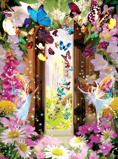 Une paire de fées ouvre une porte menant à un royaume de jardin enchanté débordant d'un arc-en-ciel de papillons.