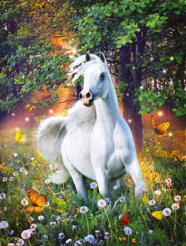 Un cheval blanc erre à travers une prairie envahie, presque brillante dans la lumière du matin.