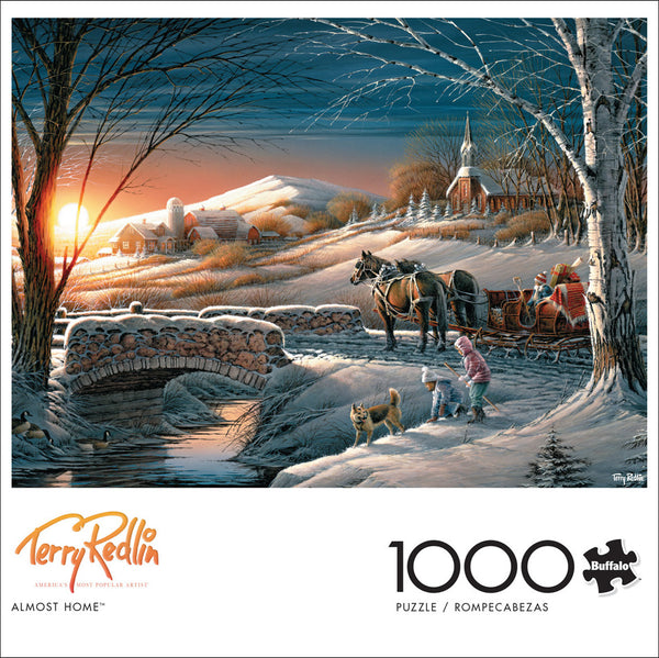 Ce puzzle de 1000 pièces de Buffalo Games de l'artiste Terry Redlin est intitulé «Presque Home». Dans cette scène hivernale tranquille et confortable, un traîneau tiré par des chevaux attend sur un pont enneigé pour continuer son voyage de retour à la grange. Au bord de l'eau, deux enfants regroupés jouent dans la neige avec leur chiot, tandis que l'on attend en arrière.