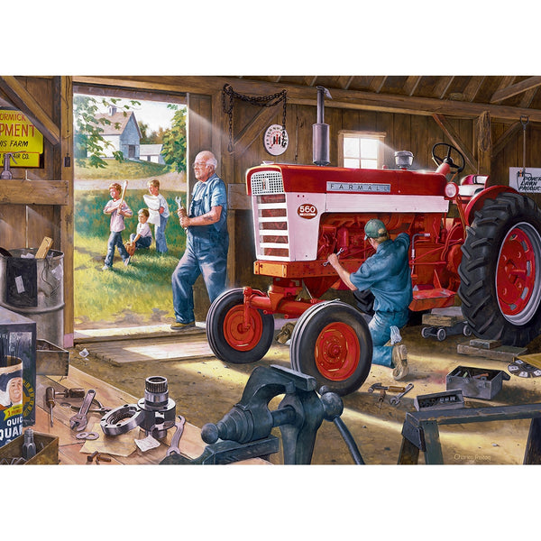 Image d'un tracteur Farmall à l'intérieur d'une grange qui travaille par deux hommes tandis que les enfants sont vus jouer par la porte. Conçu par l'artiste Charles Freitag. Collectez les 4 puzzles de la série!