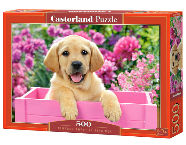 Un chiot du Labrador doré dans une caisse rose bubblegum sur fond de fleurs roses et violettes en pleine floraison. Chaque partie de ce puzzle rayonne la joie - essayez...