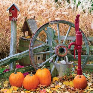 La récolte de citrouilles présente un fond de champ de blé, une subtile toile de détails tonaux contre un premier plan de rouges profonds, les gris frais des bois altérés et les points forts d'or d'une récolte de citrouilles. Ce puzzle à puanisme offre un défi ainsi qu'une nature morte intemporelle d'un moment calme dans une ferme en activité.