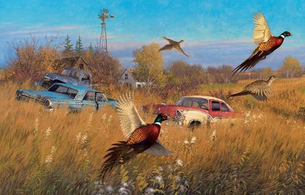 Les faisans sautent hors de la brosse et prennent le ciel.