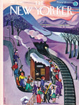 Les skieurs attendent avec impatience le train qui les transportera sur les pistes. Couverture de New Yorker par l'artiste Beatrice Tobias, initialement publiée le 24 janvier 1942