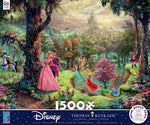 Ce puzzle de 1500 pièces comprend une peinture de Thomas Kinkade Disney Dreams of Sleeping Beauty Dancing avec son prince dans une clairière forestière.