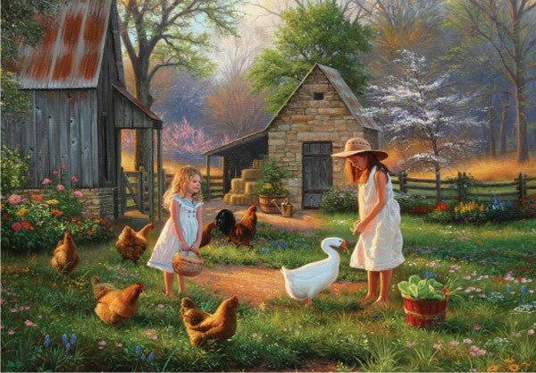 Deux filles nourrissant les oiseaux dans une ferme.