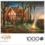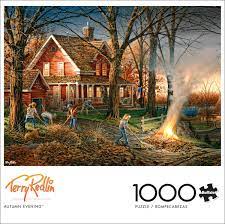 Ce puzzle de 1000 pièces intitulé Automne Evening par le célèbre peintre Terry Redlin représente un après-midi d'automne de ratissage familial. Les feuilles sont tombées alors que les arbres se préparent pour l'hiver dans cette scène pittoresque. Une famille se rasage et brûle les feuilles à l'extérieur de leur maison confortable à la campagne alors que le soleil se couche en arrière-plan.