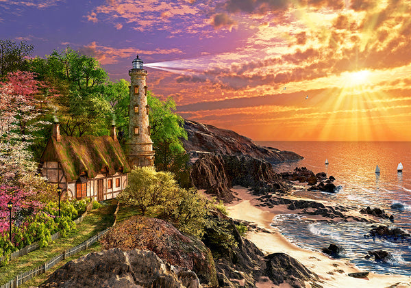 Le soleil et un vieux phare de pierre se préparent à échanger des tâches pour la nuit, le soleil tombant derrière les nuages, baignant les eaux de navigation lisses dans un or brillant. Les fleurs roses et blanches ajoutent du charme au chalet du toit de chaume déjà charmant du gardien du phare.