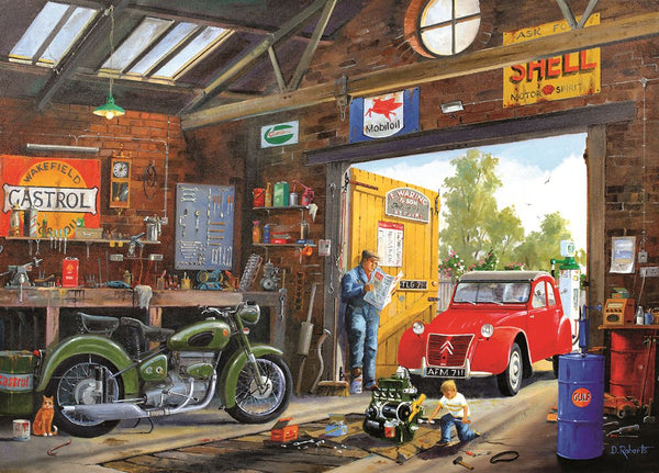 Un garçon suit les traces de son père et fixe un moteur dans le garage.