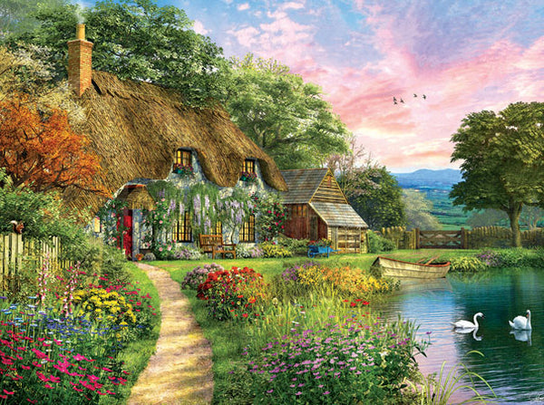 Le soleil se couche sur un chalet en pierre par un étang de cygne.