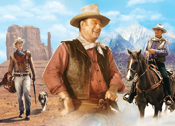 Ce puzzle des chefs-d'œuvre présente un montage de John Wayne dans les différents films dans lesquels il a joué tout au long de sa carrière. Le premier rôle principal important de Marion Morrison, et le nom de John Wayne, lui ont été donnés par le réalisateur Raoul Walsh en 1929. La photo était The Big Trail (1930), où Wayne, 22 ans, a été choisi pour jouer en tant que Scout Break Coleman. Le cow-boy préféré de l'Amérique a filmé son dernier film "The Shooting" en 1976. Il a joué dans 171 films sur une période de 50 ans.