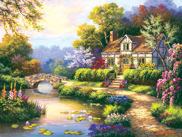 Un chemin de pierre autour d'un étang mène à un chalet pittoresque avec un charmant jardin.