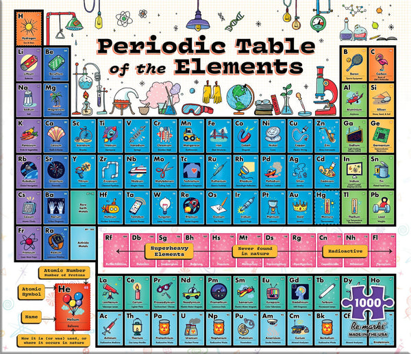 De A à Z Ce puzzle de table périodique de 1000 pièces a tous les éléments dont vous avez besoin pour rendre l'apprentissage agréable! Assemblez seul pour tester vos connaissances ou faire participer toute la famille à s'amuser. Pour un plus grand défi, essayez de terminer le puzzle sans regarder la mini affiche incluse!